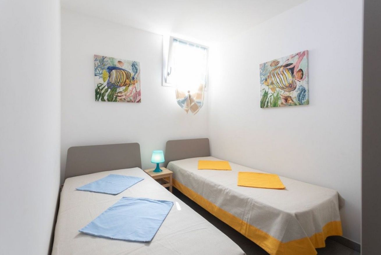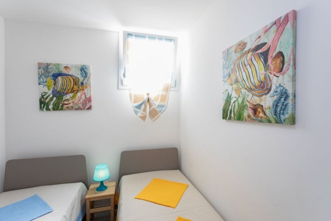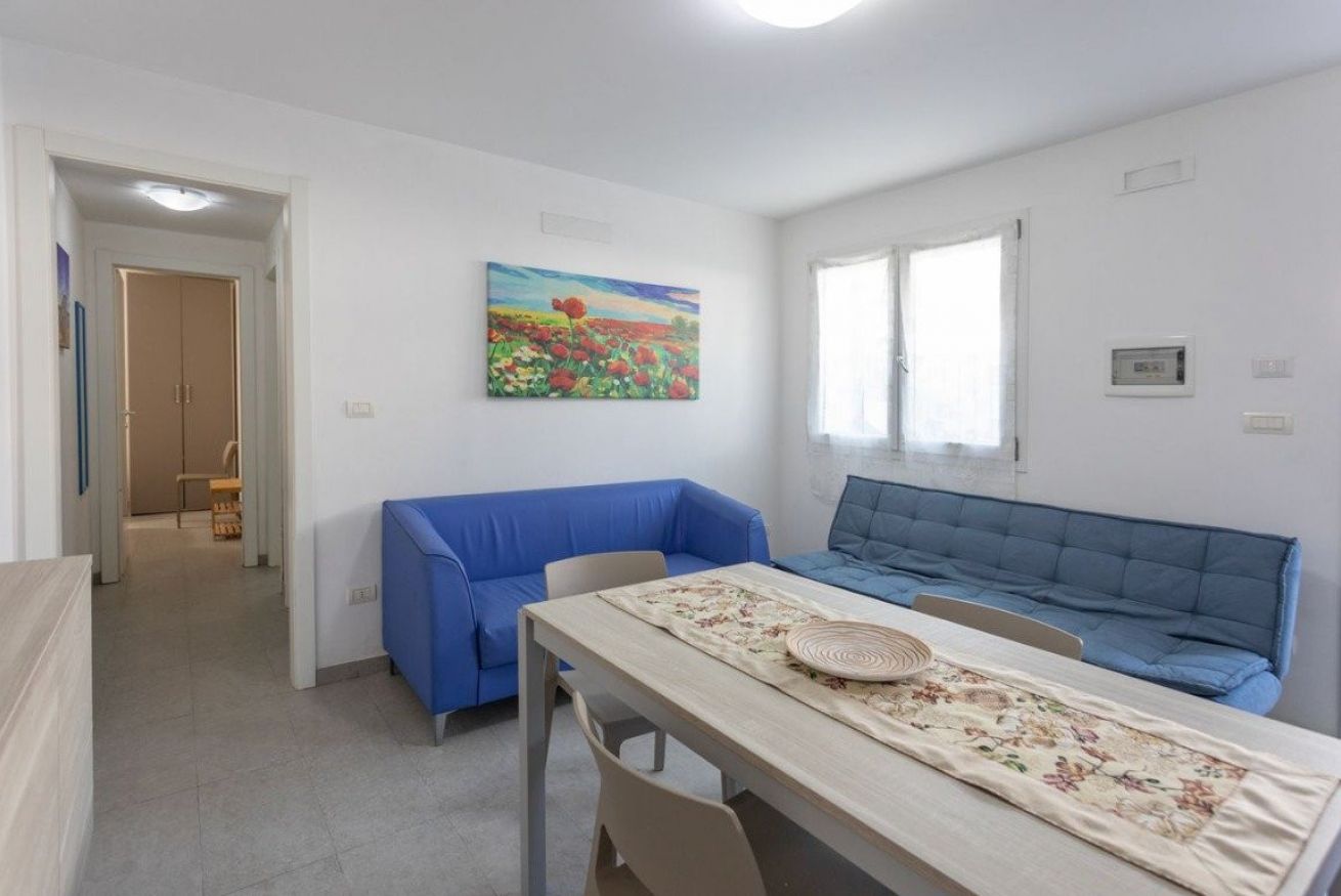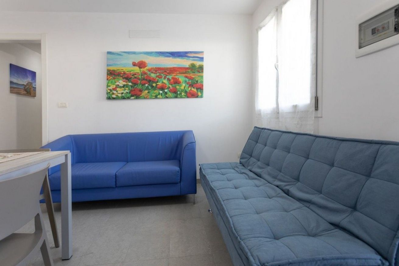 L’alloggio, situato al piano ribassato, è composto da un ampio soggiorno arredato con tavolo e sedie da pranzo, TV e zona relax con divano. La cucina è completamente attrezzata e dotata di tutto il necessario per la preparazione dei pasti. La zona notte comprende una camera da letto matrimoniale climatizzata e una camera doppia anch’essa climatizzata. Completa la soluzione un bagno con box doccia.