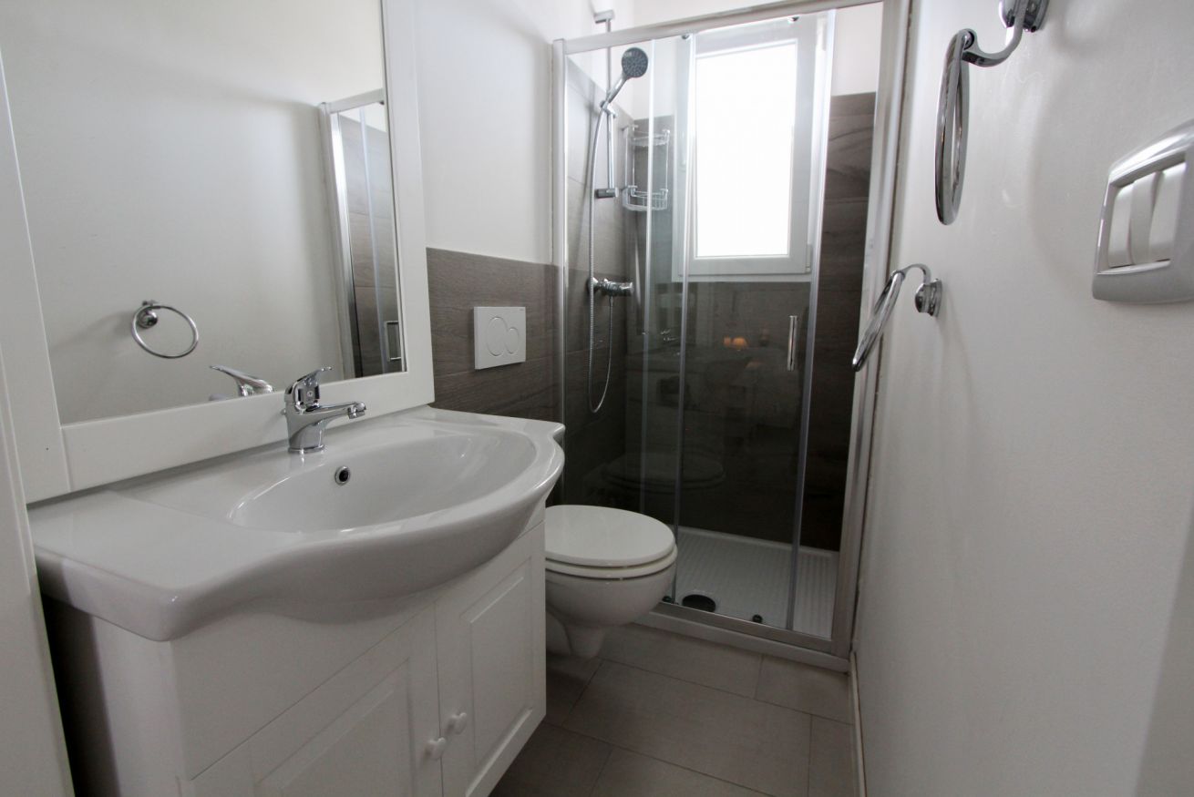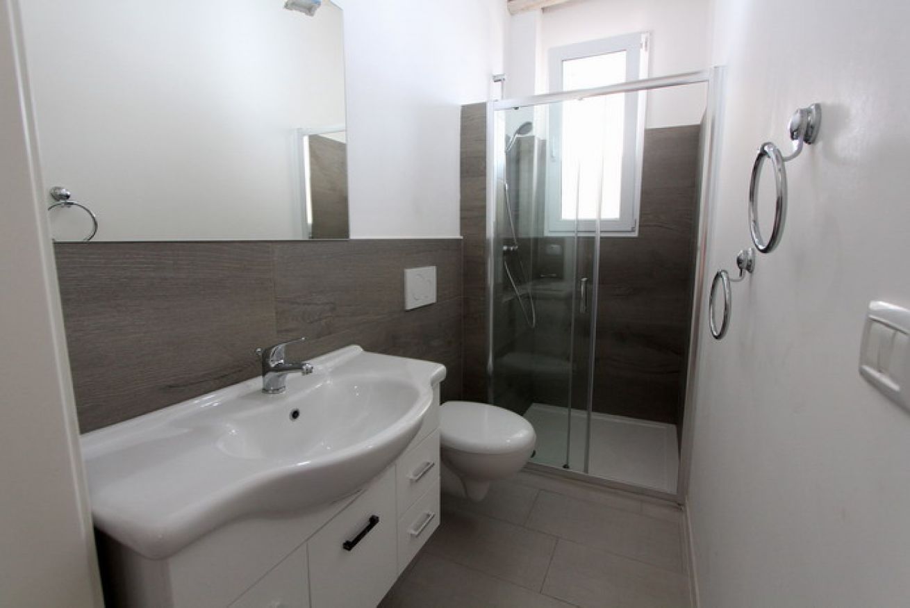 Il bagno ristrutturato (senza bidet), dotato di box doccia.