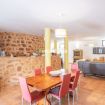 un ampio soggiorno con tavolo e sedie da pranzo;