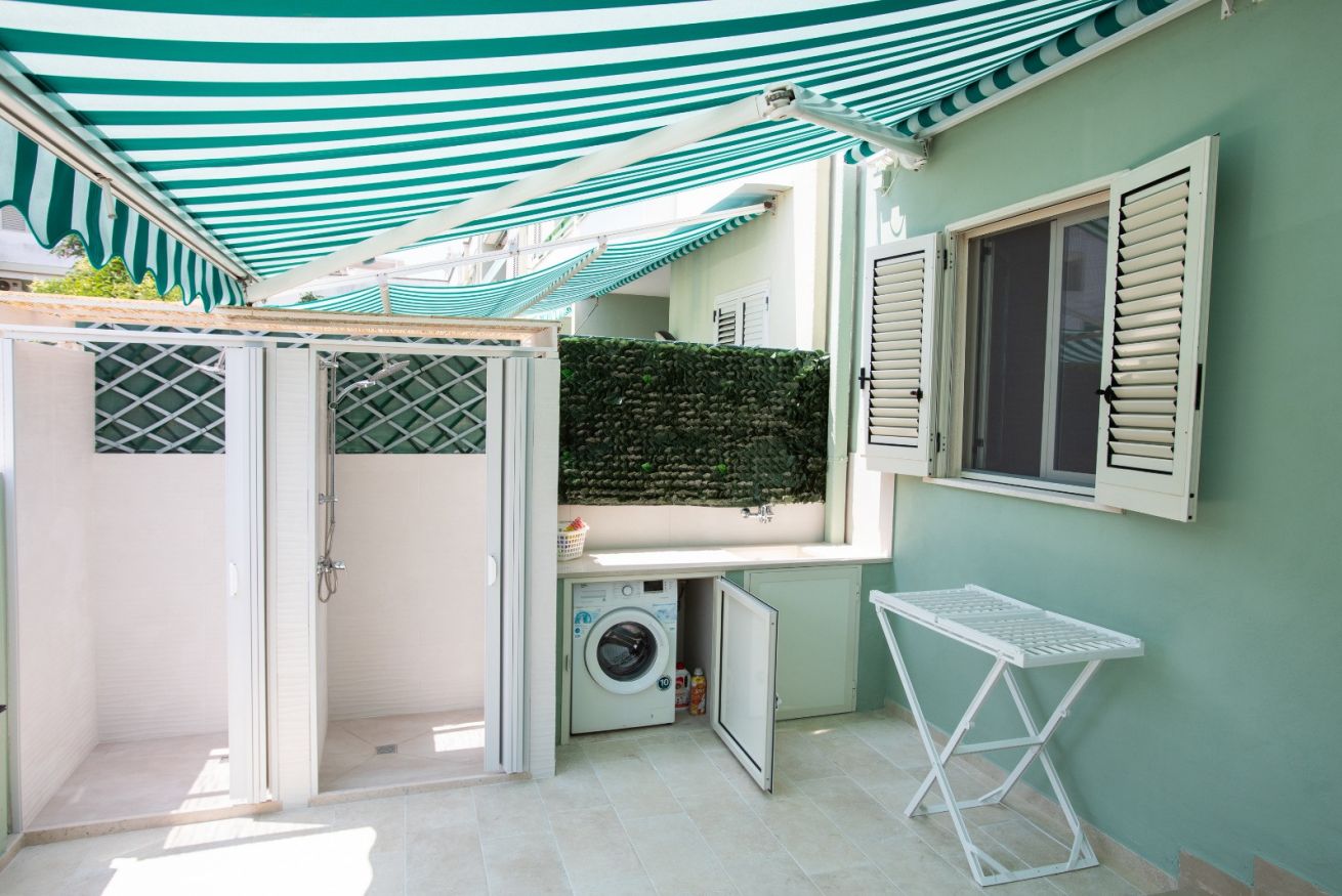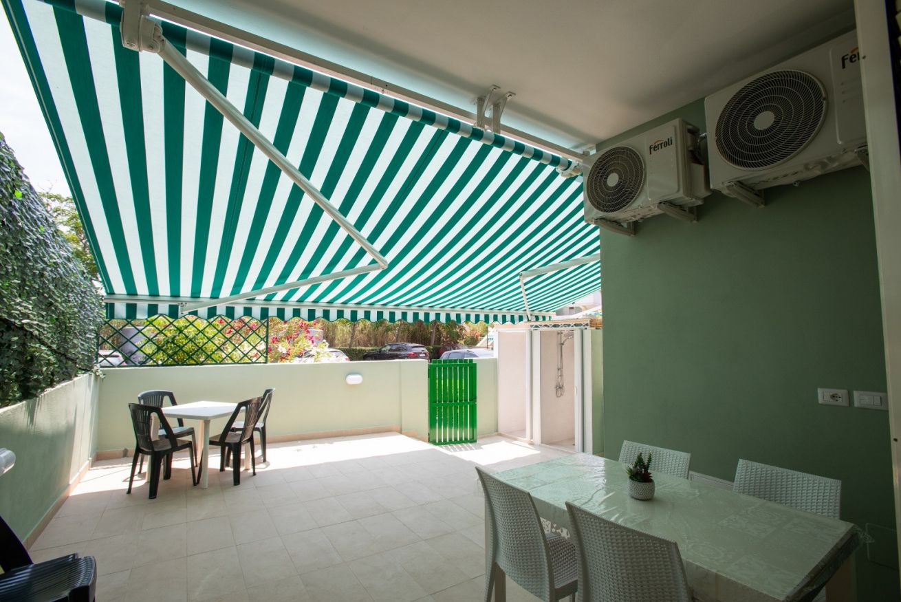 Si compone di veranda antistante dotata di posto auto, piccola veranda interna, soggiorno con divano, camera matrimoniale, stanzetta con letto a castello + 1 lettino, bagno con doccia e phon, cucina attrezzata e seconda veranda sul retro con frigobar, lavatrice, stendino, due docce esterne private con acqua calda da utilizzare prevalentemente appena si torna dal mare.